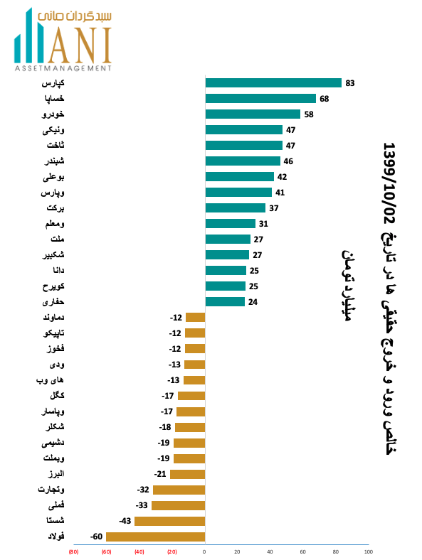 در پایان روز معاملاتی 99/10/02 شرکت های كاشي پارس و سايپا به ترتیب با 83 و 68 میلیارد تومان بیشترین ورود پول توسط حقیقی ها را داشته اند.