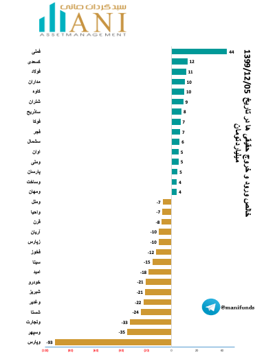 در پایان روز معاملاتی 99/12/05 شرکت های ملی صنایع مس ایران و کاشی سعدی به ترتیب با 44 و 12 میلیارد تومان بیشترین ورود پول توسط حقیقی ها را داشته اند.