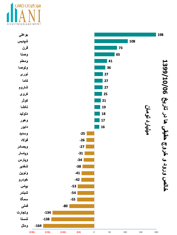 در پایان روز معاملاتی 99/10/06 شرکت های پتروشيمي بوعلي سينا و پتروشیمی پردیس به ترتیب با 198 و 108 میلیارد تومان بیشترین ورود پول توسط حقیقی ها را داشته اند.
