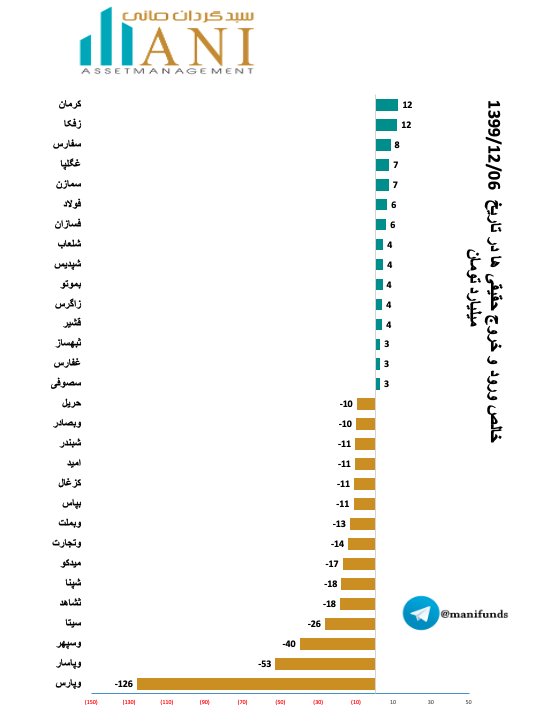در پایان روز معاملاتی 99/12/06 شرکت های س. توسعه و عمران استان کرمان و کشت و دامداری فکا به ترتیب با 12 و 12 میلیارد تومان بیشترین ورود پول توسط حقیقی ها را داشته اند.