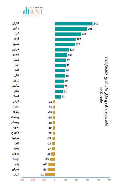 در پایان روز معاملاتی 99/05/07 شرکت های، پالايش نفت تهران و سرمايهگذاريغدير(هلدينگ) به ترتیب با 341 و 291 میلیارد تومان بیشترین ورود پول توسط حقیقی ها را داشته اند.