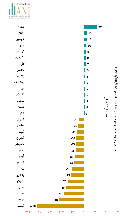 در پایان روز معاملاتی 99/08/07 شرکت های فولاد خوزستان و خدماتانفورماتيك به ترتیب با 57 و 13 میلیارد تومان بیشترین ورود پول توسط حقیقی ها را داشته اند.