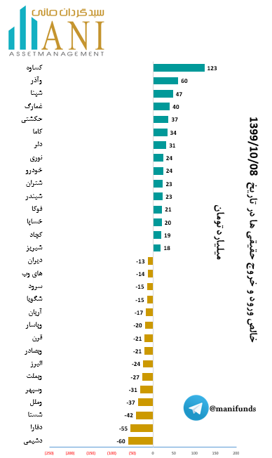 در پایان روز معاملاتی 99/10/08 شرکت های صنایع کاشی و سرمایهگذاری توسعه آذربایجان به ترتیب با 123 و 60 میلیارد تومان بیشترین ورود پول توسط حقیقی ها را داشته اند.