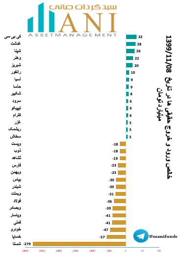 در پایان روز معاملاتی 99/11/08 شرکت های فروشگاههای شرکت کی بی سی و دشت مرغاب به ترتیب با 32 و 28 میلیارد تومان بیشترین ورود پول توسط حقیقی ها را داشته اند.