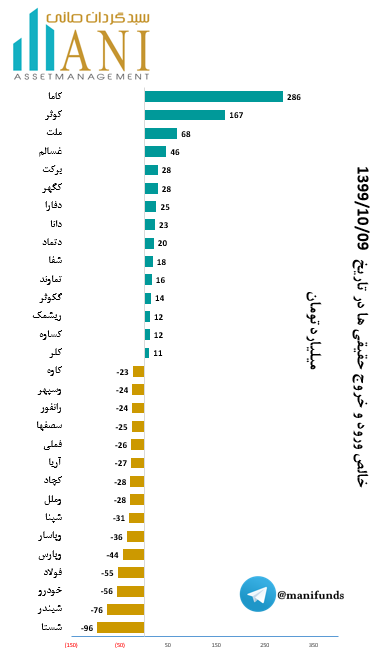 در پایان روز معاملاتی 99/10/09 شرکت های صنایع‌ باما و بیمه کوثر‌ به ترتیب با 286 و 167 میلیارد تومان بیشترین ورود پول توسط حقیقی ها را داشته اند.