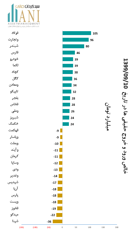 در پایان روز معاملاتی 99/09/10 شرکت های فولاد مباركه اصفهان و بانك تجارت به ترتیب با 105 و 96 میلیارد تومان بیشترین ورود پول توسط حقیقی ها را داشته اند.