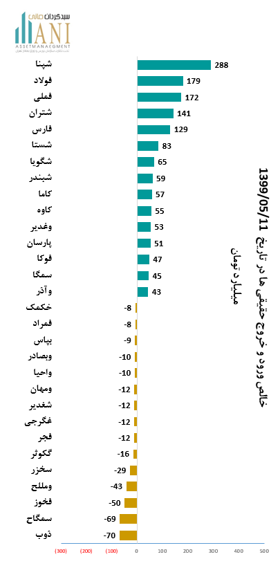 در پایان روز معاملاتی 99/05/11 شرکت های، پالايش نفت اصفهان و فولاد مباركه اصفهان به ترتیب با 288 و 179 میلیارد تومان بیشترین ورود پول توسط حقیقی ها را داشته اند.