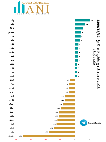 در پایان روز معاملاتی 99/12/12 شرکت های فرآوری معدنی اپال کانی پارس و پشم شیشه ایران به ترتیب با 20 و 14 میلیارد تومان بیشترین ورود پول توسط حقیقی ها را داشته اند.