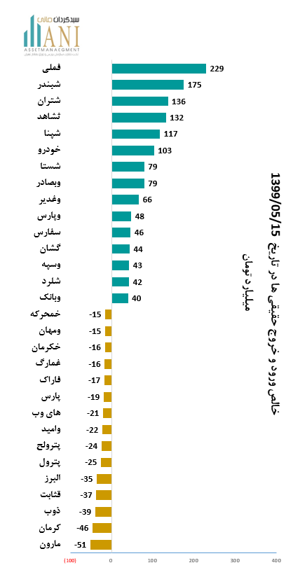 در پایان روز معاملاتی 99/05/15 شرکت های، ملي صنايع مس ايران وپالايش نفت بندرعباس به ترتیب با 229 و 175 میلیارد تومان بیشترین ورود پول توسط حقیقی ها را داشته اند.