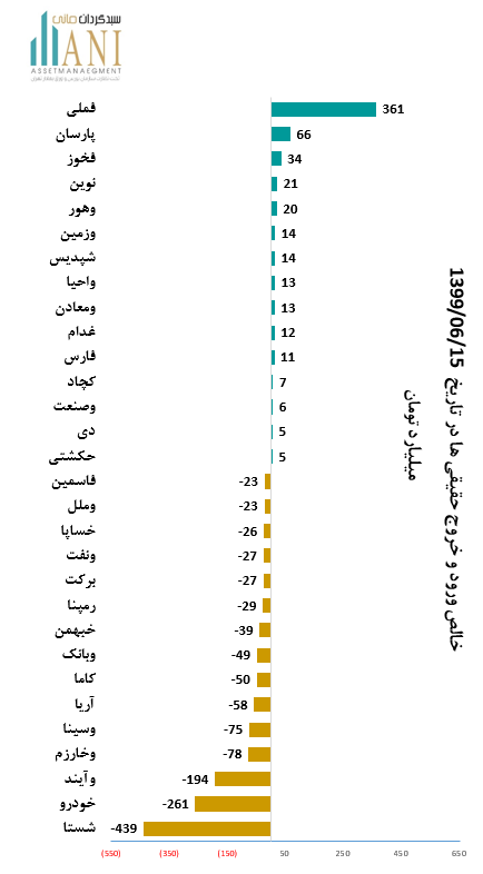 در پایان روز معاملاتی 99/06/15 شرکت های،ملي صنايع مس ايران و گسترش نفت و گاز پارسيان به ترتیب با 361 و 66 میلیارد تومان بیشترین ورود پول توسط حقیقی ها را داشته اند.