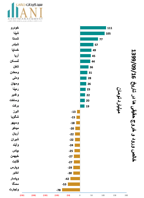 در پایان روز معاملاتی 99/09/16 شرکت های ايران خودرو و پالايش نفت اصفهان به ترتیب با 111 و 105 میلیارد تومان بیشترین ورود پول توسط حقیقی ها را داشته اند.