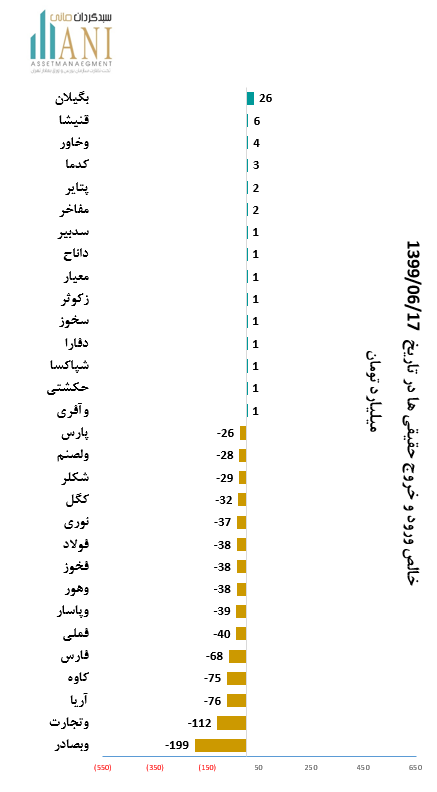 در پایان روز معاملاتی 99/06/16 شرکت های،توسعه مسير برق گيلان و قند نيشابور به ترتیب با 26 و 6 میلیارد تومان بیشترین ورود پول توسط حقیقی ها را داشته اند.