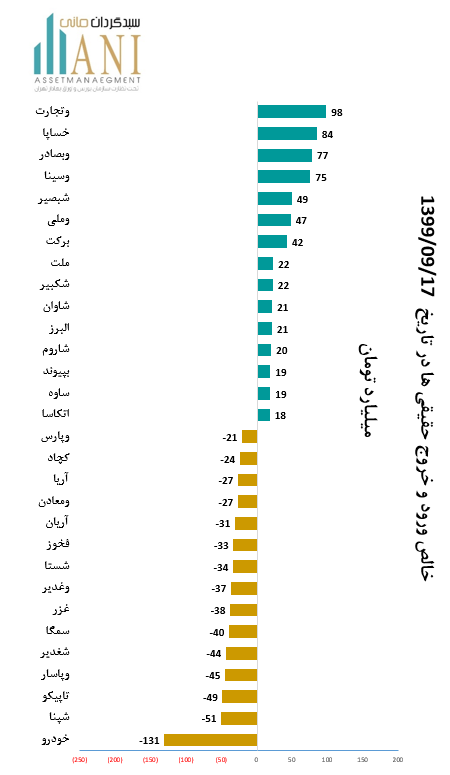در پایان روز معاملاتی 99/09/17 شرکت های بانك تجارت و سايپا به ترتیب با 98 و 84 میلیارد تومان بیشترین ورود پول توسط حقیقی ها را داشته اند.