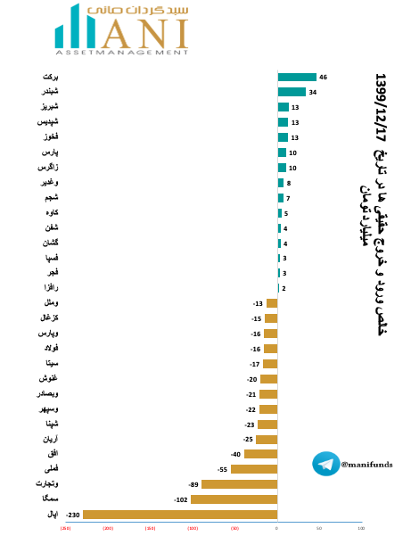 در پایان روز معاملاتی 99/12/17 شرکت های گروه دارویی برکت و پالایش نفت بندرعباس به ترتیب با 46 و 34 میلیارد تومان بیشترین ورود پول توسط حقیقی ها را داشته اند.