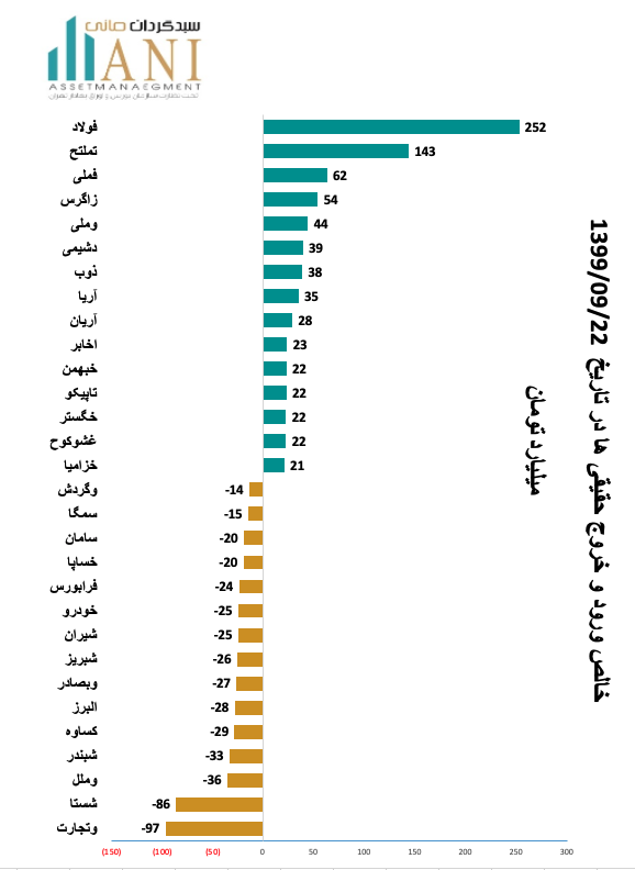 در پایان روز معاملاتی 99/09/19 شرکت های فولاد مباركه اصفهان و ح . تامين سرمايه بانك ملت به ترتیب با 252 و 143 میلیارد تومان بیشترین ورود پول توسط حقیقی ها را داشته اند.