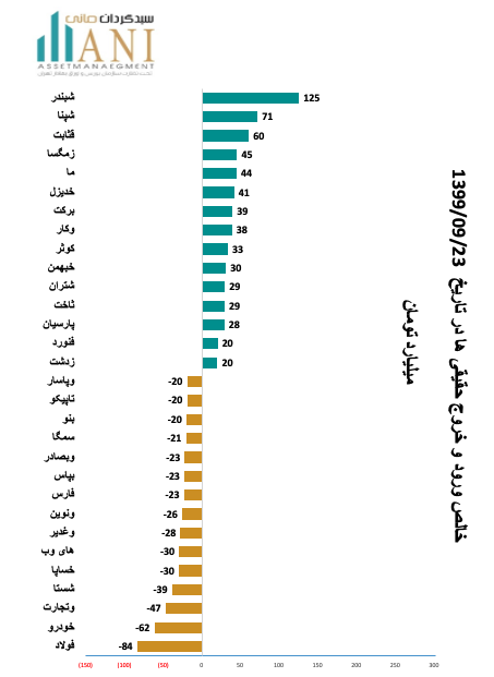در پایان روز معاملاتی 99/09/23 شرکت های پالايش نفت بندرعباس و پالايش نفت اصفهان به ترتیب با 125 و 71 میلیارد تومان بیشترین ورود پول توسط حقیقی ها را داشته اند.