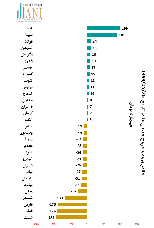 در پایان روز معاملاتی 99/05/26 شرکت های،پليمر آريا ساسول و سرمايه گذاري سيمان تامين به ترتیب با 199 و 181 میلیارد تومان بیشترین ورود پول توسط حقیقی ها را داشته اند.