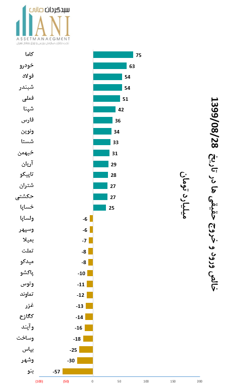 در پایان روز معاملاتی 99/08/27 شرکت های باما‌ و ایران خودرو به ترتیب با 75 و 63 میلیارد تومان بیشترین ورود پول توسط حقیقی ها را داشته اند.
