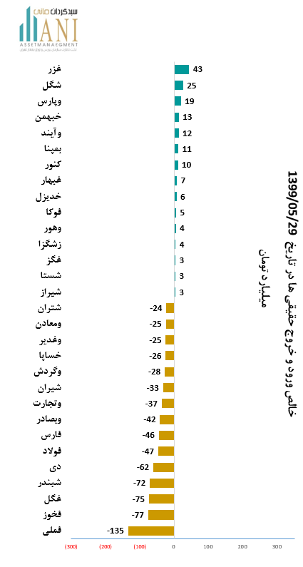 15 شرکت با بیشترین خالص ورود و خروج حقیقی ها در تاریخ 1399/05/29