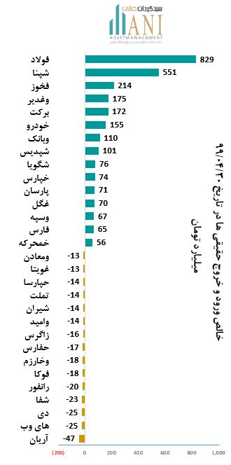 15 شرکت با بیشترین خالص ورود و خروج حقیقی ها در تاریخ 1399/04/30