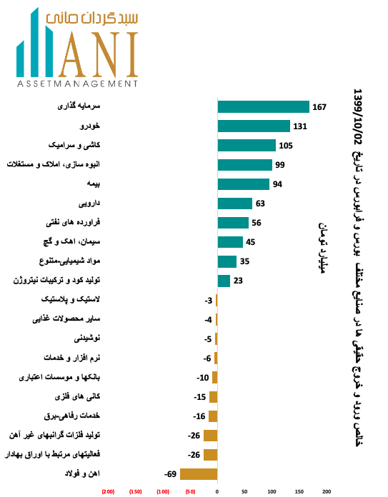در پایان روز معاملاتی 99/10/02 صنایع سرمایه گذاری و خودرو به ترتیب با 167 و 131 میلیارد تومان بیشترین ورود پول توسط حقیقی ها را داشته اند.