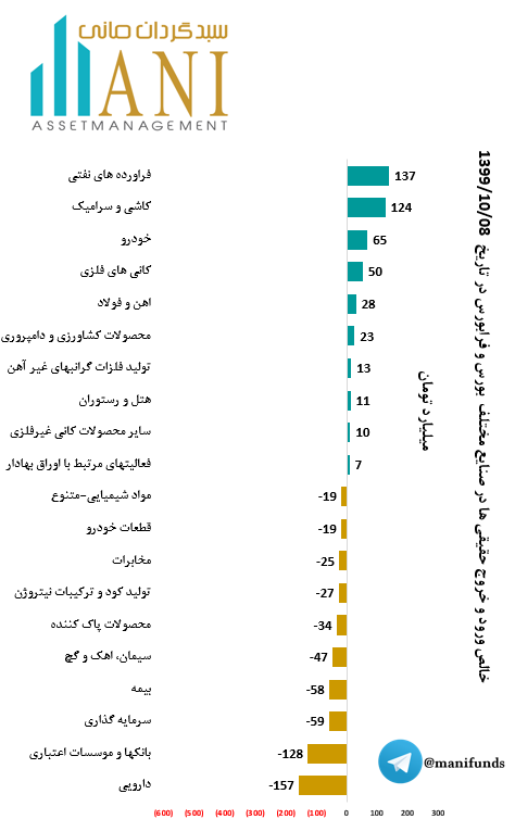 در پایان روز معاملاتی 99/10/08 صنایع فراورده های نفتی و کاشی و سرامیک به ترتیب با 137 و 124 میلیارد تومان بیشترین ورود پول توسط حقیقی ها را داشته اند.
