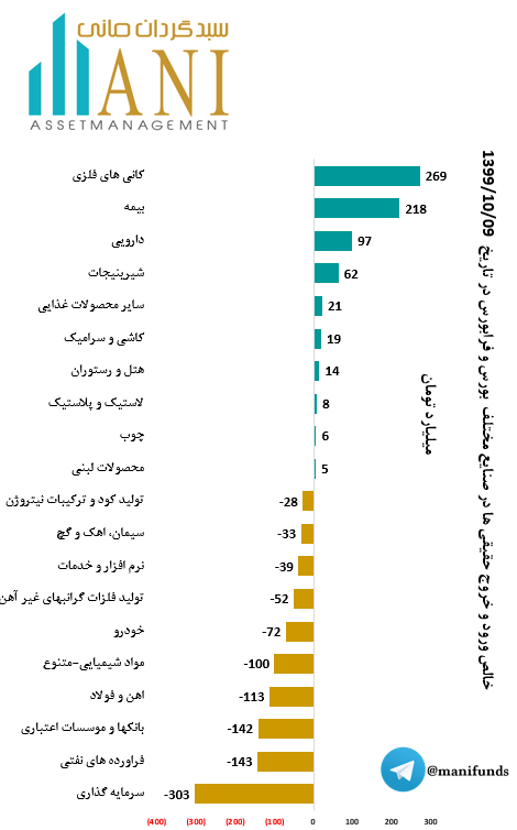 در پایان روز معاملاتی 99/10/09 صنایع کانی های فلزی و بیمه به ترتیب با 269 و 218 میلیارد تومان بیشترین ورود پول توسط حقیقی ها را داشته اند.