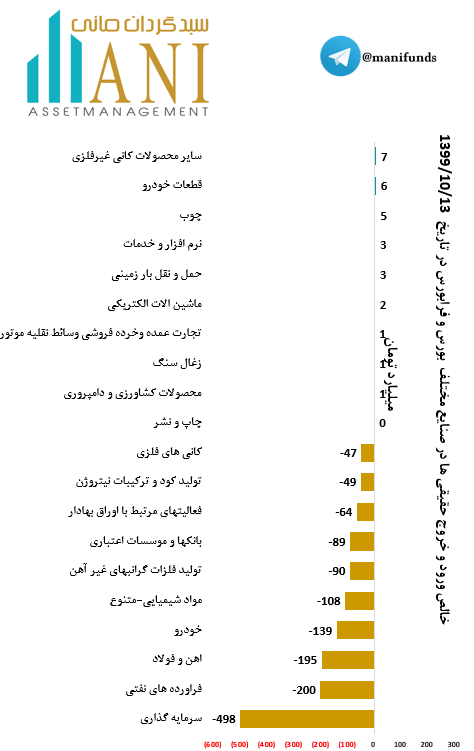 در پایان روز معاملاتی 99/10/13 صنایع سایر محصولات کانی غیرفلزی و قطعات خودرو به ترتیب با 7 و 6 میلیارد تومان بیشترین ورود پول توسط حقیقی ها را داشته اند.