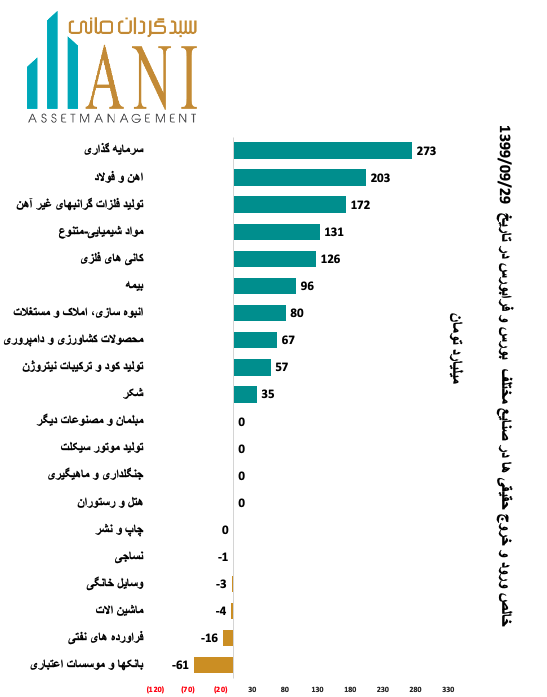 در پایان روز معاملاتی 99/09/29 صنایع سرمایه گذاری و اهن و فولاد به ترتیب با 273 و 203 میلیارد تومان بیشترین ورود پول توسط حقیقی ها را داشته اند.