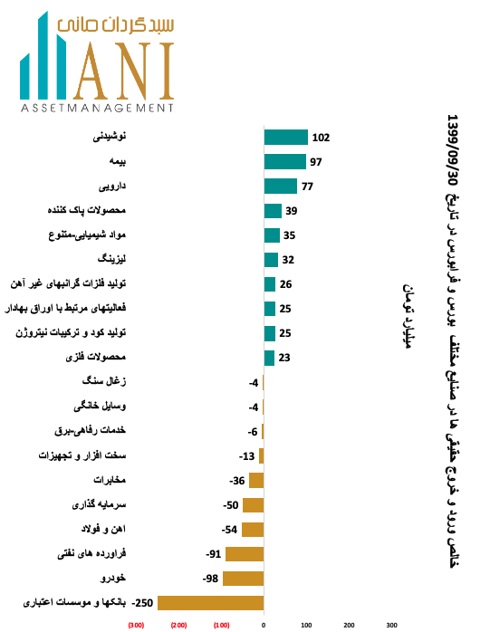 در پایان روز معاملاتی 99/09/30 صنایع نوشیدنی و بیمه به ترتیب با 102 و 97 میلیارد تومان بیشترین ورود پول توسط حقیقی ها را داشته اند.