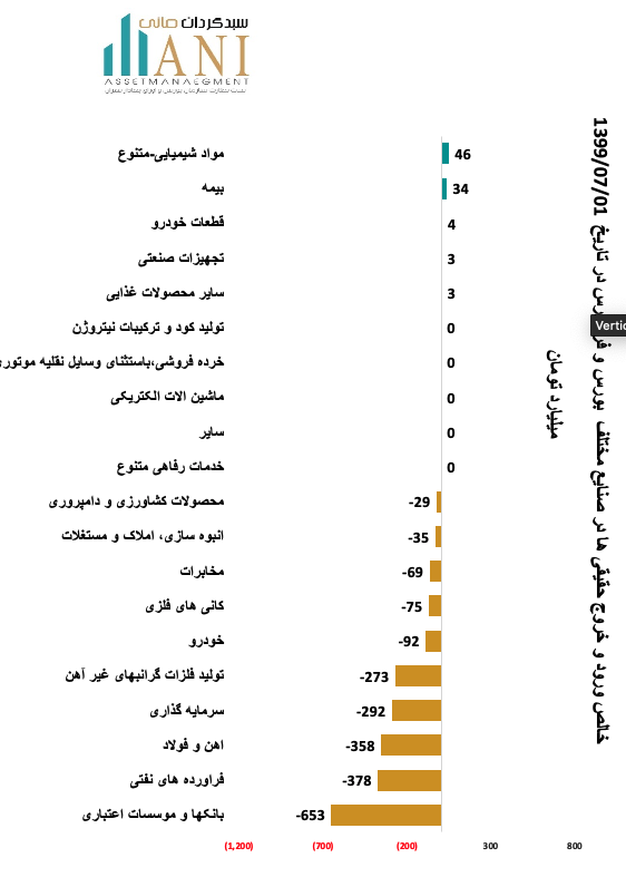 در پایان روز معاملاتی 99/07/01 مواد شیمیایی و بیمه به ترتیب با 46 و 34 میلیارد تومان بیشترین ورود پول توسط حقیقی ها را داشته اند.