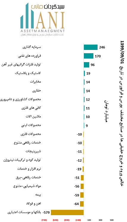 در پایان روز معاملاتی 99/09/01 صنایع سرمایه گذاری و فراورده های نفتی به ترتیب با 246 و 170 میلیارد تومان بیشترین ورود پول توسط حقیقی ها را داشته اند.
