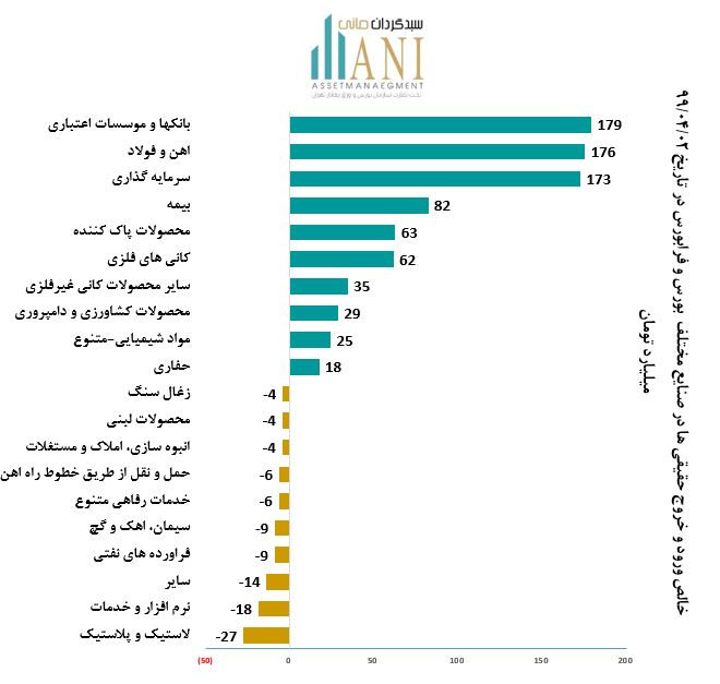 در پایان روز معاملاتی 99/04/02 صنایع،بانک ها، آهن و فولاد و سرمایه گذاری به ترتیب با 179, 176 و 173 میلیارد تومان بیشترین ورود پول توسط حقیقی ها را داشته اند.