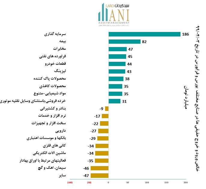 در پایان روز معاملاتی 99/04/03 صنایع،سرمایه گذاری، بیمه و مخابرات  و  به ترتیب با 186, 82 و 47 میلیارد تومان بیشترین ورود پول توسط حقیقی ها را داشته اند.