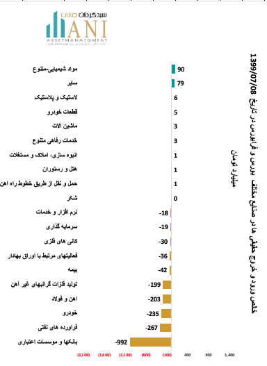در پایان روز معاملاتی 99/07/08 مواد شیمیایی و سایر به ترتیب با 90 و 79 میلیارد تومان بیشترین ورود پول توسط حقیقی ها را داشته اند.