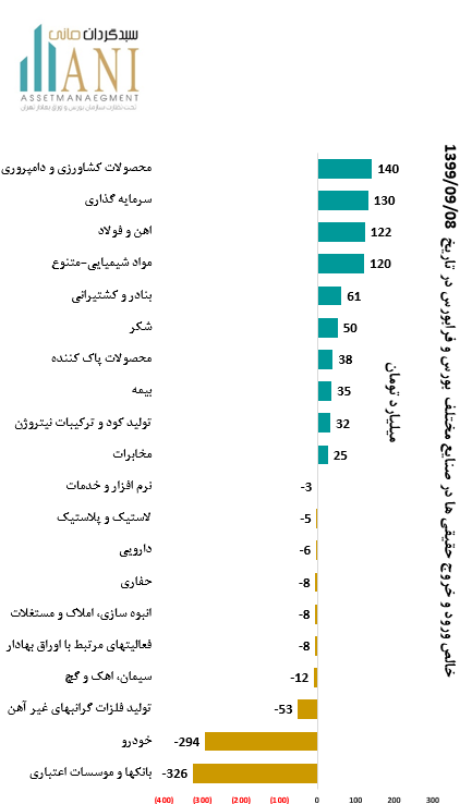 در پایان روز معاملاتی 99/09/08 صنایع اهن و محصولات کشاورزی و سرمایه گذاری به ترتیب با 140 و 130 میلیارد تومان بیشترین ورود پول توسط حقیقی ها را داشته اند.