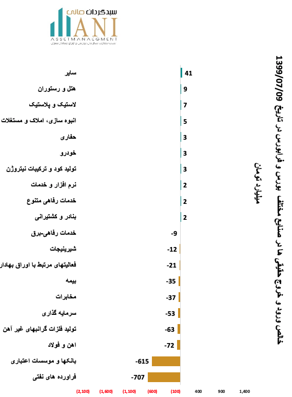 در پایان روز معاملاتی 99/07/09 سایر و هتل و رستوران به ترتیب با 41 و 9 میلیارد تومان بیشترین ورود پول توسط حقیقی ها را داشته اند.