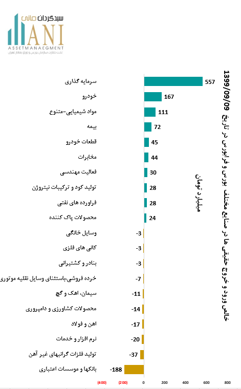 در پایان روز معاملاتی 99/09/09 صنایع خودرو و سرمایه گذاری به ترتیب با 557 و 167 میلیارد تومان بیشترین ورود پول توسط حقیقی ها را داشته اند.