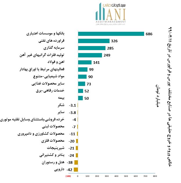 در پایان روز معاملاتی 99/04/11 صنایع،بانک ها، فراورده های نفتی، سرمایه گذاری و تولید فلزات گرانبهای غیر آهن به ترتیب با 686, 326, 285 و 249 میلیارد تومان بیشترین ورود پول توسط حقیقی ها را داشته اند.