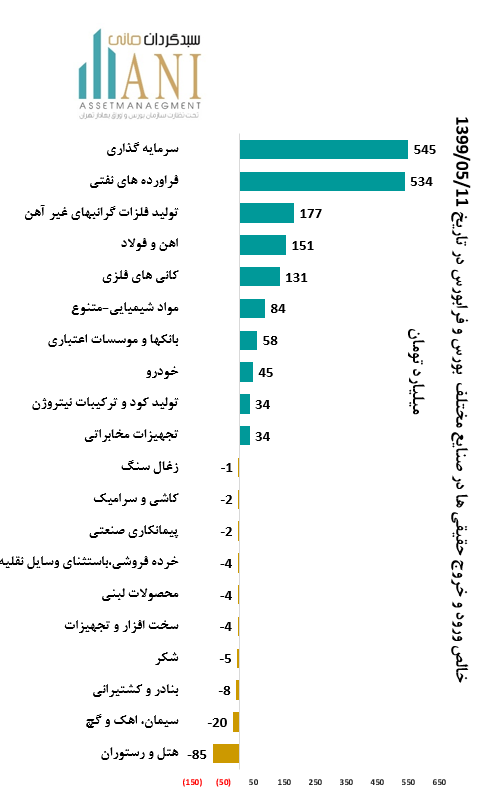 در پایان روز معاملاتی 99/05/08 صنایع، سرمایه گذاری,فرآورده های نفتی و آهن و تولید فلزات گرانبهای غیر آهن به ترتیب با 545, 534 و 177میلیارد تومان بیشترین ورود پول توسط حقیقی ها را داشته اند.