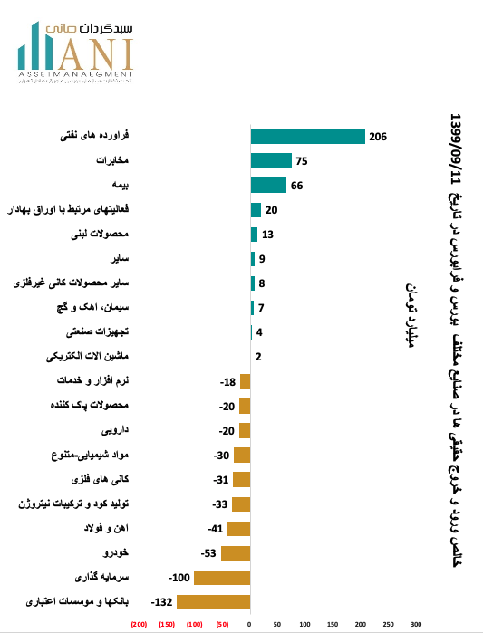 در پایان روز معاملاتی 99/09/11 صنایع فراورده های نفتی و مخابرات به ترتیب با 206 و 75 میلیارد تومان بیشترین ورود پول توسط حقیقی ها را داشته اند.