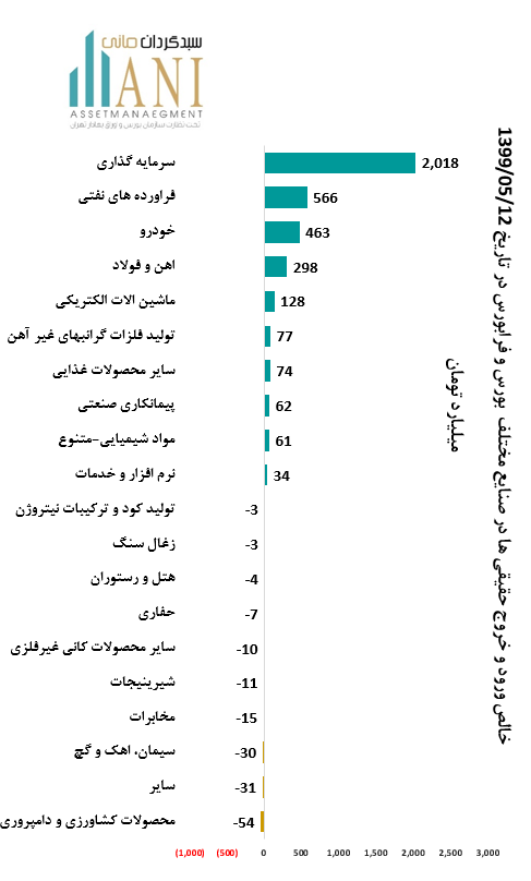 در پایان روز معاملاتی 99/05/12 صنایع، سرمایه گذاری,فرآورده های نفتی و خودرو به ترتیب با 2,018 , 566 و 463 میلیارد تومان بیشترین ورود پول توسط حقیقی ها را داشته اند.