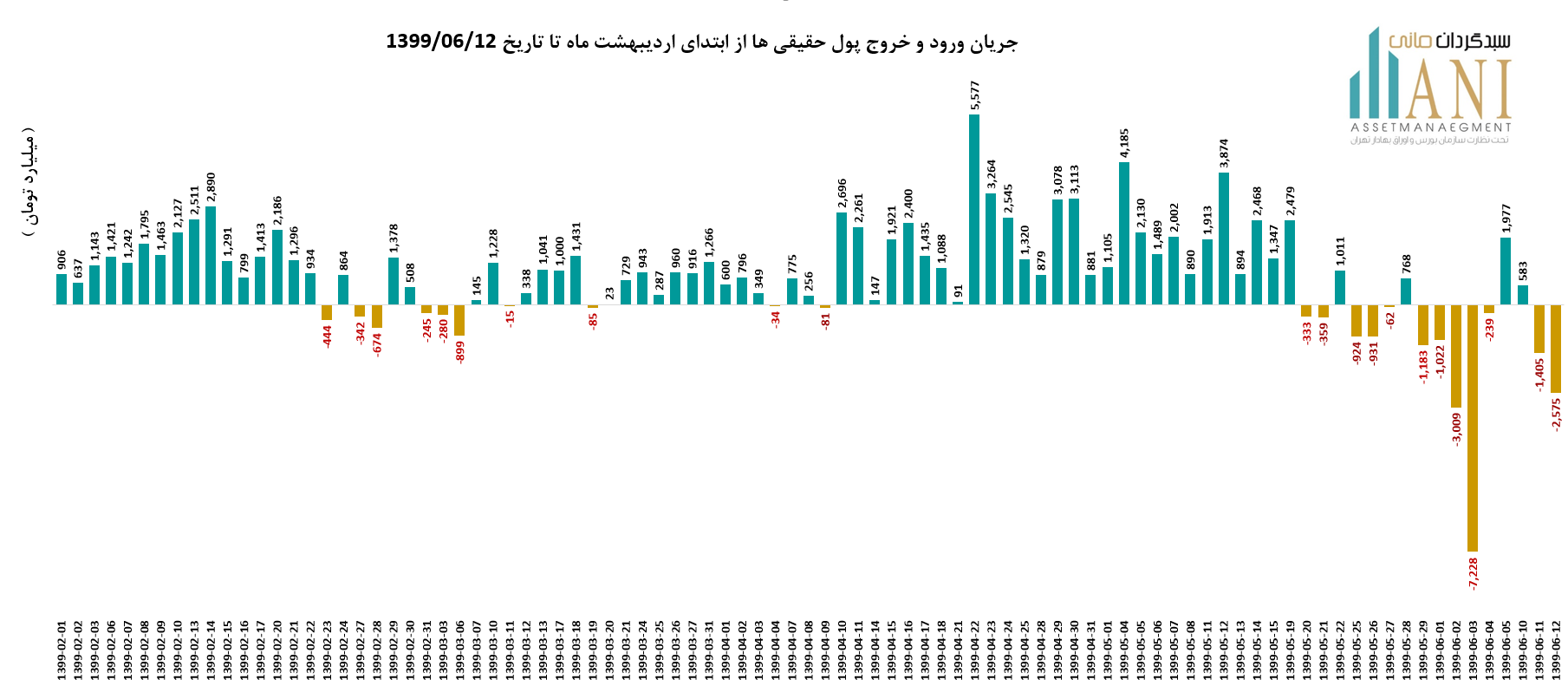 در پایان روز معاملاتی 99/06/12 خالص جریان ورود و خروج پول حقیقی ها حدود منفی 2,575 میلیارد تومان می باشد. جریان ورود و خروج پول حقیقی ها در سال جاری بدین صورت بوده است: