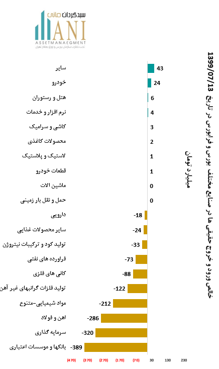 در پایان روز معاملاتی 99/07/13 صنایع سایر و خودرو به ترتیب با 43 و 24 میلیارد تومان بیشترین ورود پول توسط حقیقی ها را داشته اند.