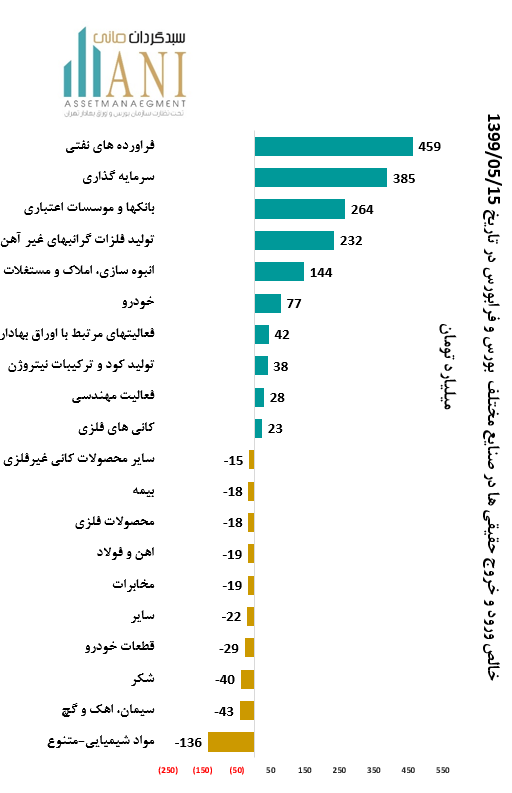 در پایان روز معاملاتی 99/05/15 صنایع، فرآورده های نفتی,سرمایه گذاری و بانک ها ترتیب با 459, 385 و 264 میلیارد تومان بیشترین ورود پول توسط حقیقی ها را داشته اند.