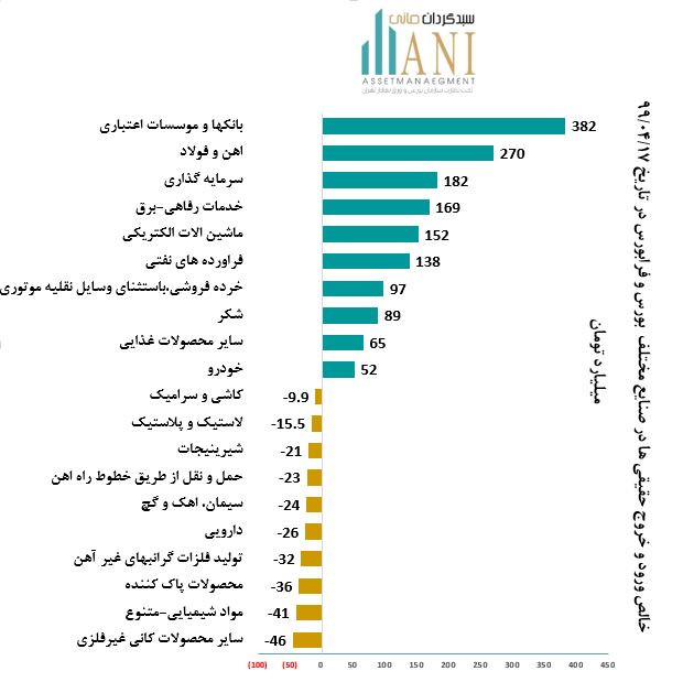 در پایان روز معاملاتی 99/04/17 صنایع،بانک ها، آهن و فولاد، سرمایه گذاری و خدمات رفاهی-برق به ترتیب با 382, 270, 182 و 169 میلیارد تومان بیشترین ورود پول توسط حقیقی ها را داشته اند.