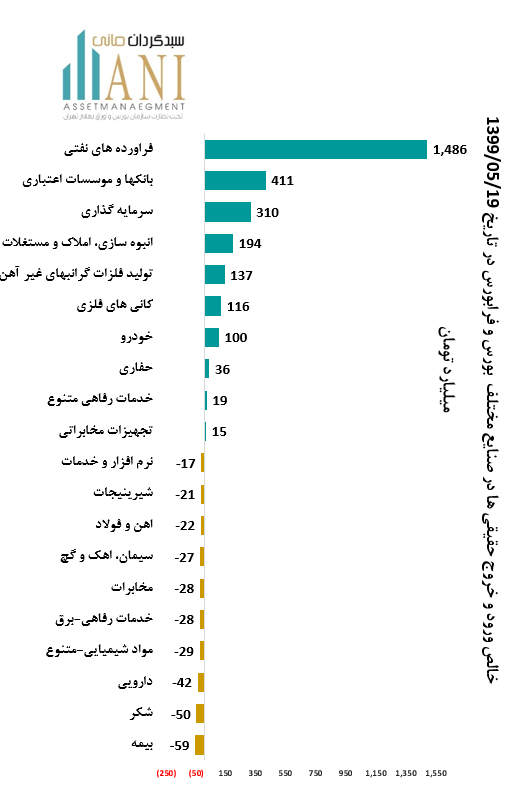 در پایان روز معاملاتی 99/05/19 صنایع، فرآورده های نفتی, بانک ها و سرمایه گذاری ترتیب با 1,486 , 411 و 310 میلیارد تومان بیشترین ورود پول توسط حقیقی ها را داشته اند.