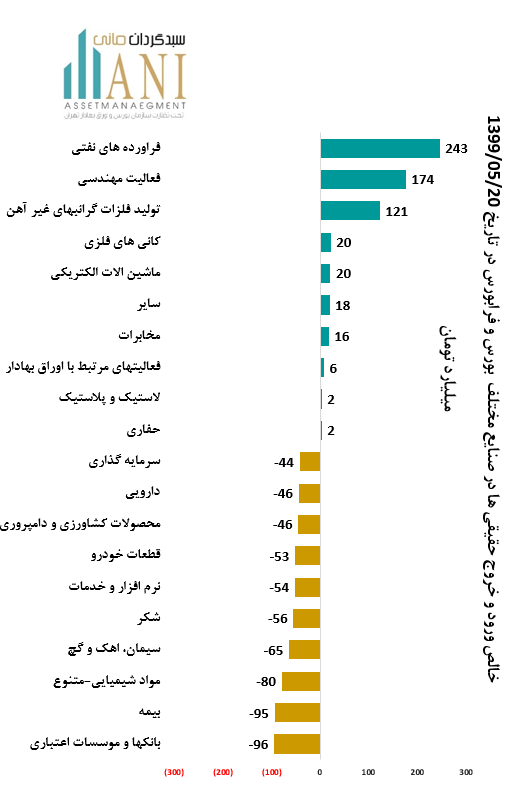 در پایان روز معاملاتی 99/05/20 صنایع، فرآورده های نفتی, فعالیت های مهندسی و تولید فلزات گرانبهای غیر آهن ترتیب با 243, 174 و 121 میلیارد تومان بیشترین ورود پول توسط حقیقی ها را داشته اند.