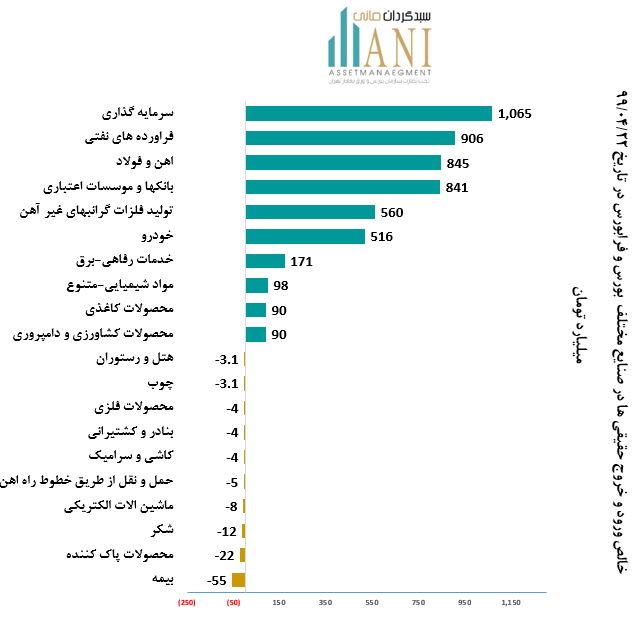 در پایان روز معاملاتی 99/04/22 صنایع، سرمایه گذاری،فرآورده های نفتی، آهن و فولاد و بانک ها به ترتیب با 1,065 , 906, 845 و 841 میلیارد تومان بیشترین ورود پول توسط حقیقی ها را داشته اند.
