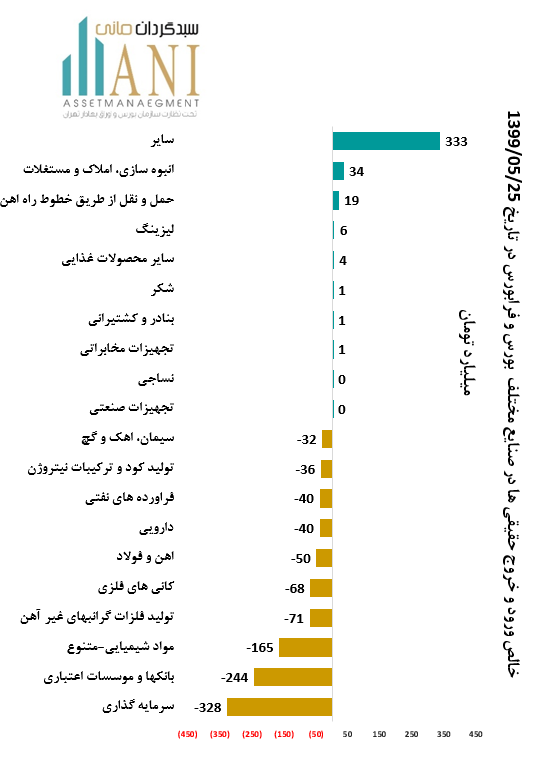 در پایان روز معاملاتی 99/05/25 صنایع، سایر, انبوه سازی، املاک و مستغلات و حمل و نقل از طریق خطوط راه آهن ترتیب با 333, 34 و 19 میلیارد تومان بیشترین ورود پول توسط حقیقی ها را داشته اند.